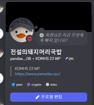 ํ•œ๊ตญ๋””์ง€ํ„ธ๋ฏธ๋””์–ด๊ณ ๋“ฑํ•™๊ต 23๊ธฐ ์›น ํ”„๋กœ๊ทธ๋ž˜๋ฐ๊ณผ์—์„œ ํ•ดํ‚น์„ ๊ณต๋ถ€ํ•˜๊ณ  ์žˆ๋Š” pandas์ž…๋‹ˆ๋‹ค.